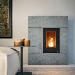 Poêle à pellets sans bouche frontale, réalisé avec structure en acier peint, porte en verre et revêtement frontal en pierre serpentine ou en acier peint de couleur White, Bordeaux, Dark.