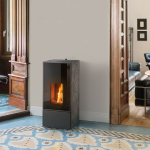 Poêle à pellets sans bouches frontales à profondeur réduite, avec la possibilité d’être installé très près du mur.