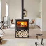 Poêle à bois avec compartiment inférieur portebûches en acier peint en noir.