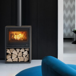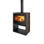 Poêle à bois avec compartiment inférieur portebûches, flancs et couvercle en nouvelle finition matérique “Materia Tortora”, “Materia Piombo” ou “Materia Corten”.