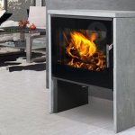 Il vous propose un foyer placé légèrement en hauteur de 50 cm fermé par une large porte afin de vous proposer une vision du feu confortable ainsi qu'un vaste bûcher ouvert en partie basse.