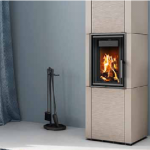 Poêle à bois en céramique avec vitre pliée d'une seule pièce et porte pivotante.